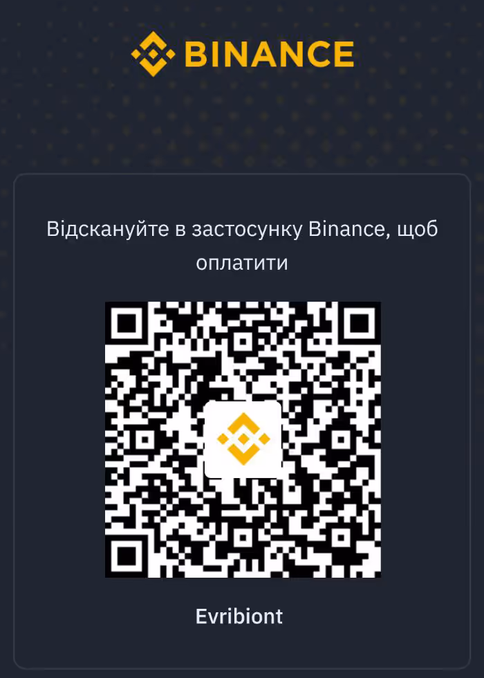 Ви можете використовувати QR-код Binance (переклад з Binance на Binance) або надіслати кошти на Binanc Id: 1045076445